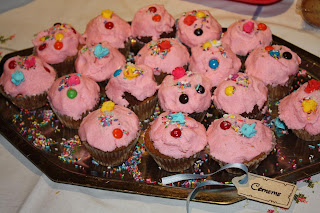 También hubo cupcakes. Yo no tengo la menor idea de cocina, pero quería hacer algo divertido para que las chicas me ayudaran. Entonces compre unas magdalenas de Bimbo y les hice la pasta que lleva arriba (receta de cupcakes que encontré en el diario Clarín). Les compré cositas para decorarlos, florcitas de azúcar, m&m, etc, y las niñas hicieron la decoración. Se divirtieron mucho y llenaron la cocina de dulzura, literalmente había dulces por todos lados :)