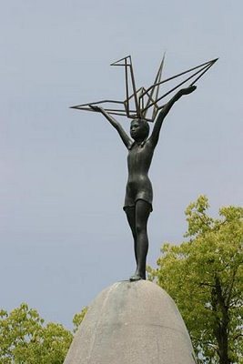 Alrededor del monumento miles de personas llevan sus grullas de papel para recordar a Sadako y a todos los niños muertos por la bombas.