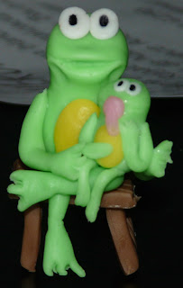 Aquí mi última ranita con su pequeña bebé en brazos. El banquito también es de porcelana :)